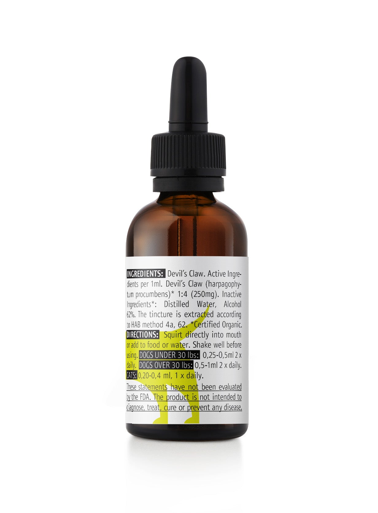Natural Distillation: Devil's Claw Tincture extracts from the dried root of Harpagophytum procumbens according to HAB method 4a, 55 (1:10 dried root/alcohol). The purest and most natural distillation of water and 55% alcohol makes our product which will help your pet improve its mobility and will relieve its muscle pain as an analgesic.